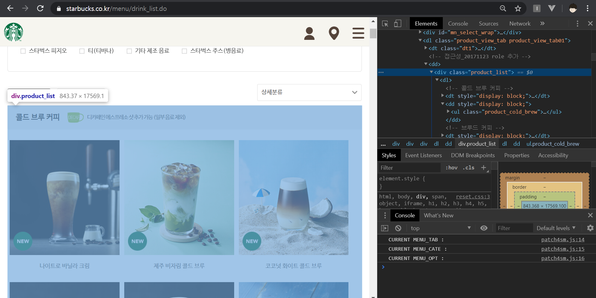 따라서 우리는 스타벅스 메뉴 페이지를 가서 현재 메뉴들의 product_cd들을 수집하겠습니다.