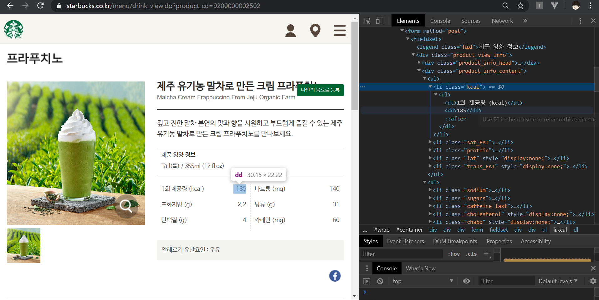Python을 이용하여 스타벅스 홈페이지에 존재하는 메뉴들의 제품 정보(이미지, 영양정보 등)를 크롤링하기